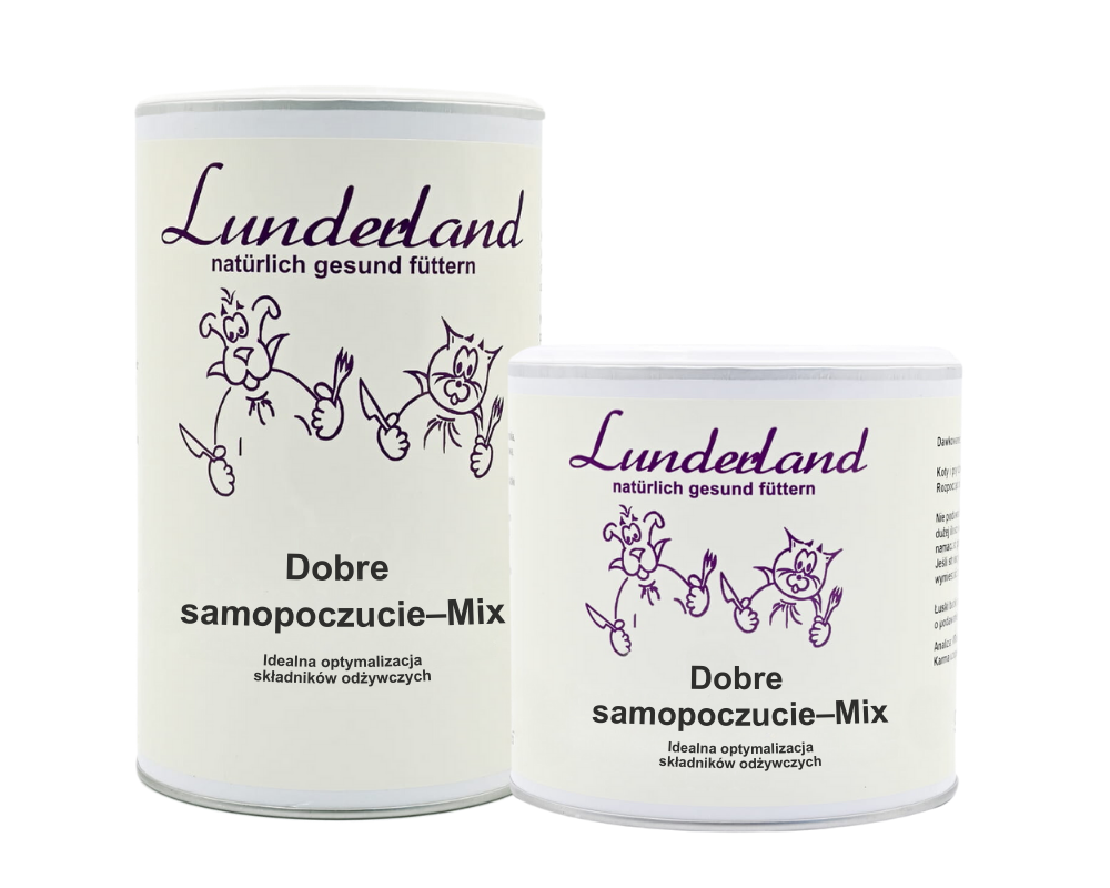 Lunderland Dobre samopoczucie–Mix podstawowy 500 g to starannie skomponowana mieszanka roślinna dla psów i kotów, która może być podawana jako żywieniowe wsparcie codziennej witalności, odporności i zrównoważonego metabolizmu. Połączenie lecytyny słonecznikowej, drożdży piwnych, mączki z alg morskich, moringi, lucerny, pokrzywy, skórek dzikiej róży, pyłków kwiatowych, spiruliny, mikroalg Schizochytrium i orzechów brazylijskich uzupełnia dietę w szerokie spektrum naturalnych składników odżywczych.