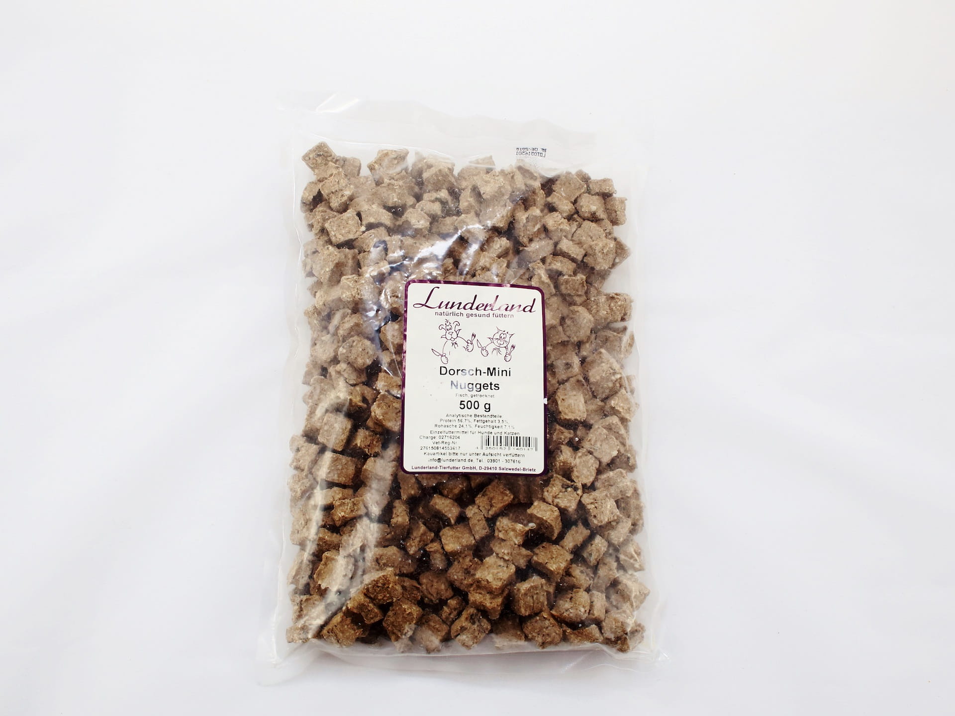 Nuggetsy z dorsza to mały, poręczny przysmak idealny do treningu i nagradzania. Zawierają cenne kwasy omega-3 korzystne dla skóry i sierści.