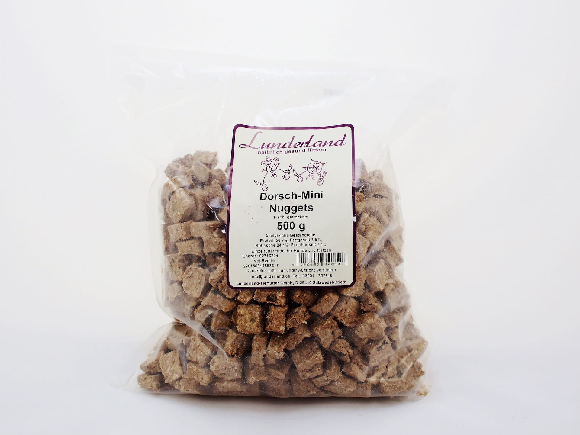 Lunderland dorsz mini nuggetsy 500 g to naturalna, suszona przekąska z ryby dla psów. Mini Nuggetsy wykonane w 100% z ryby, bez sztucznych dodatków.