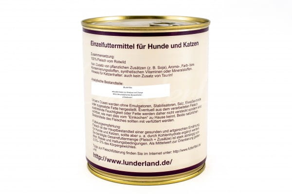 Puszka Lunderland zawiera wyłącznie jeleń w jakości spożywczej (food grade). Bez zbóż, cukru, sztucznych konserwantów, barwników czy aromatów. Mięso pochodzi z kontrolowanych hodowli w Niemczech.