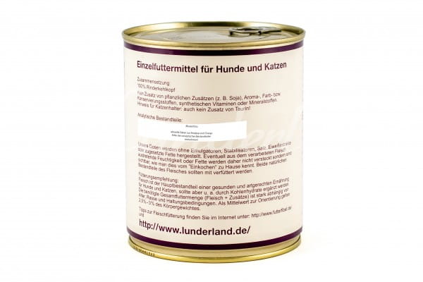 Puszka Lunderland zawiera wyłącznie wołowina w jakości spożywczej (food grade). Bez zbóż, cukru, sztucznych konserwantów, barwników czy aromatów. Mięso pochodzi z kontrolowanych hodowli w Niemczech.