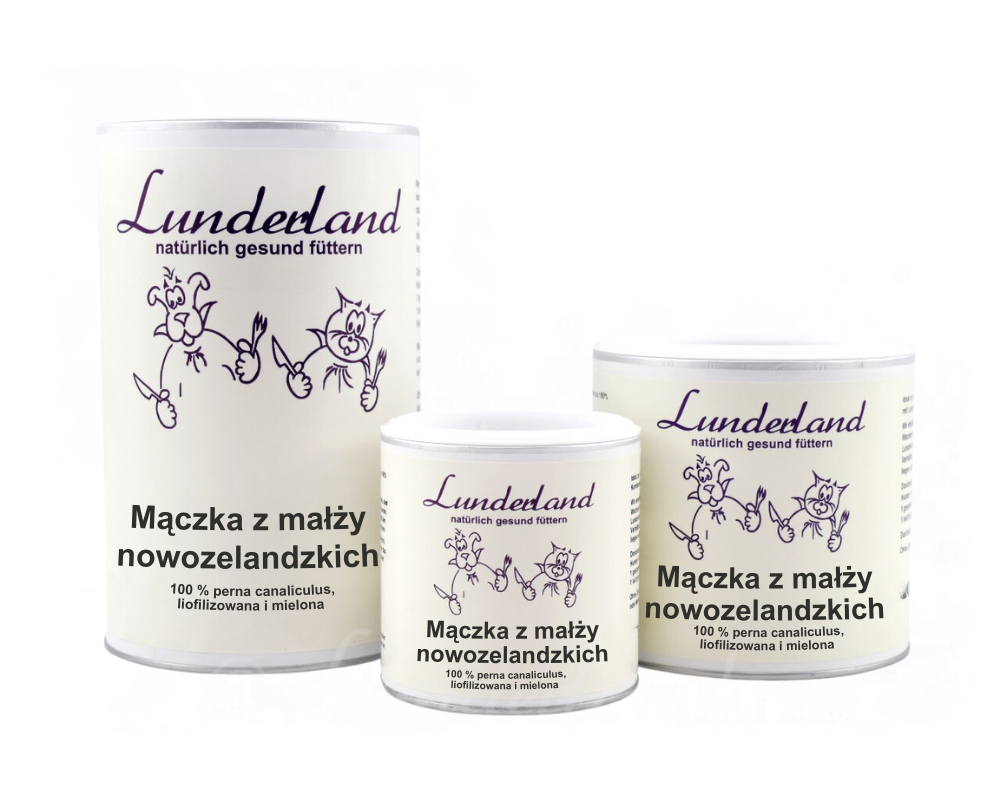 Lunderland mączka z liofilizowanych małży nowozelandzkich to 100% Perna canaliculus bez dodatków. Powstaje wyłącznie z mięsa małży, bez muszli, dzięki czemu w opakowaniu znajduje się tylko najcenniejsza żywieniowo część surowca.