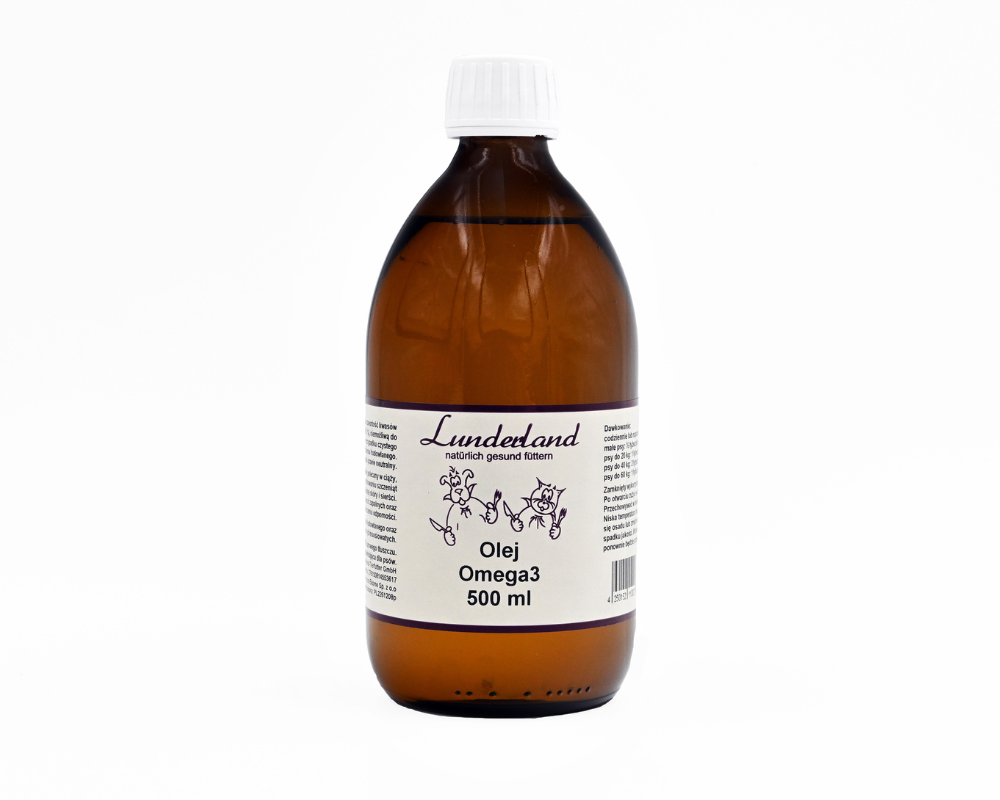 Lunderland olej Omega3 500 ml to naturalny olej najwyższej jakości, tłoczony na zimno. Doskonały dodatek do diety BARF i karmy mokrej dla psów i kotów.