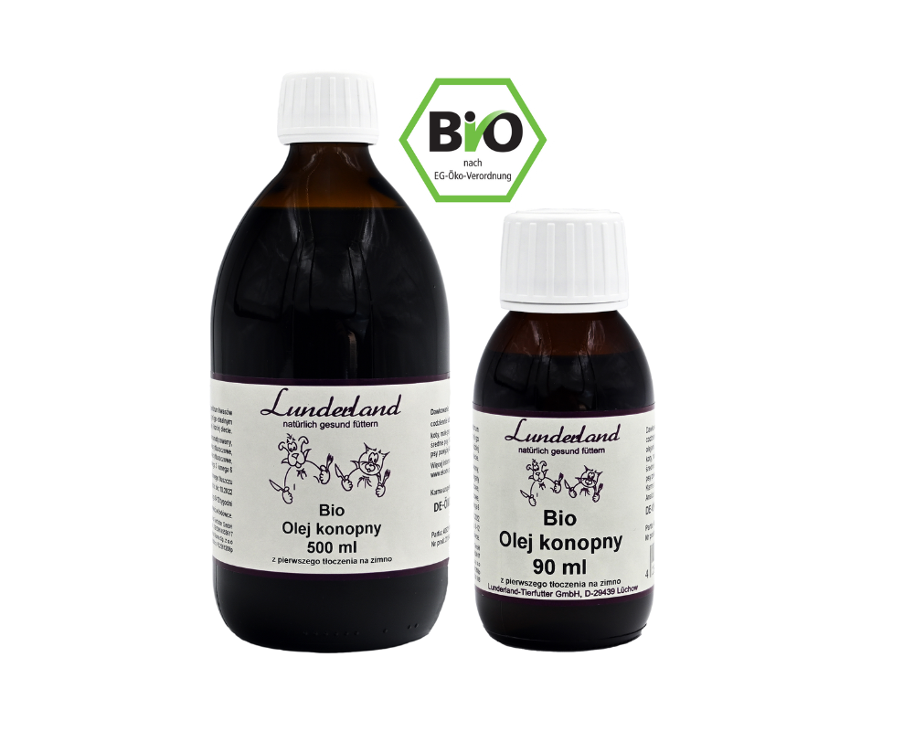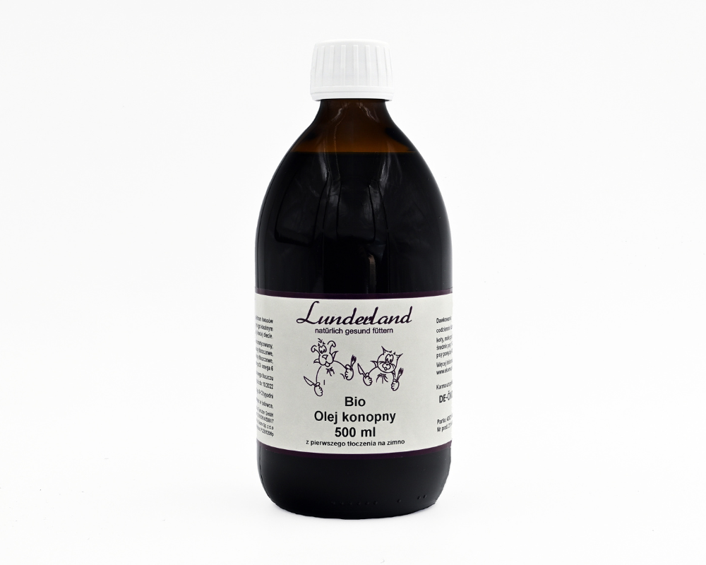 Lunderland organiczny olej konopny BIO 500 ml to naturalny olej najwyższej jakości, tłoczony na zimno. Doskonały dodatek do diety BARF i karmy mokrej dla psów i kotów.