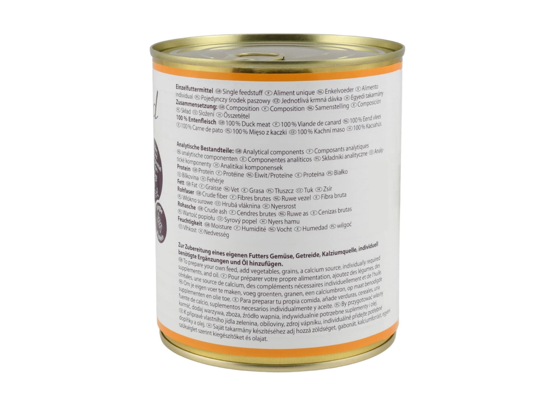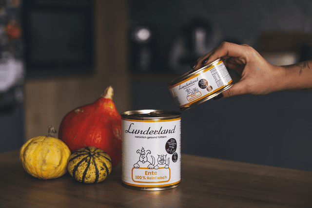 Puszka Lunderland zawiera wyłącznie kaczka w jakości spożywczej (food grade). Bez zbóż, cukru, sztucznych konserwantów, barwników czy aromatów. Mięso pochodzi z kontrolowanych hodowli w Niemczech.