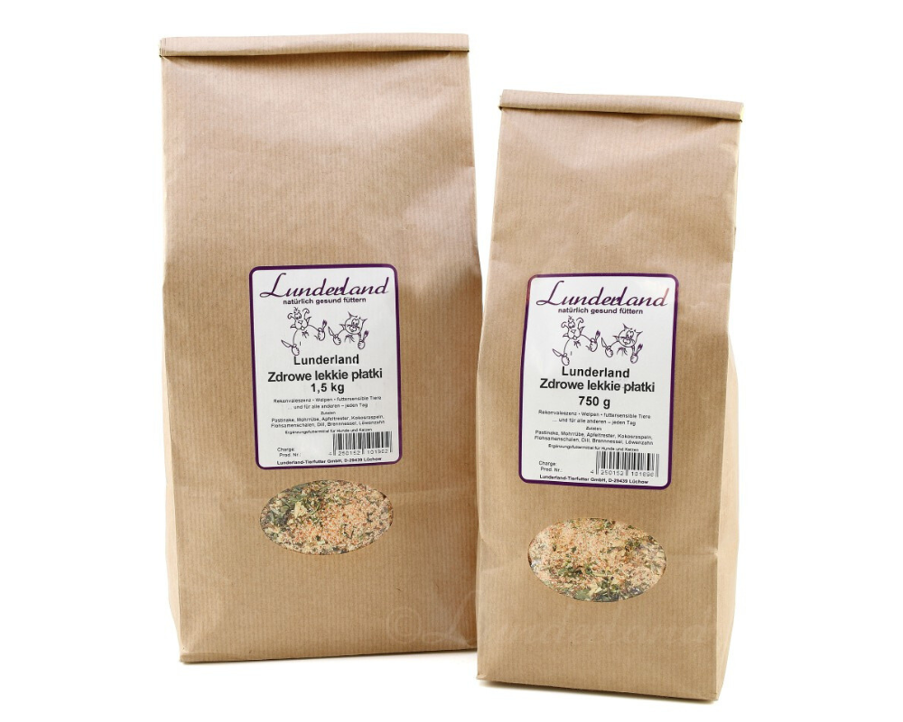 Lunderland zdrowe lekkie płatki 750 g to naturalne płatki warzywno-owocowe Lunderland - idealne uzupełnienie diety BARF o błonnik i witaminy.