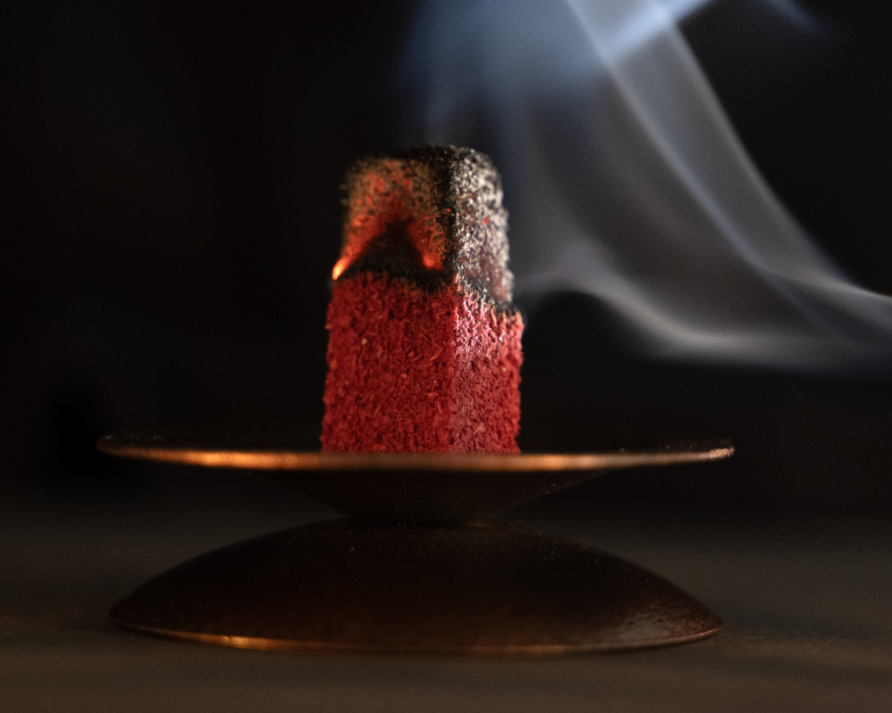 Kadzidło ma formę niewielkich kostek w charakterystycznym czerwonym kolorze, które spalają się samodzielnie – bez użycia węgielka.